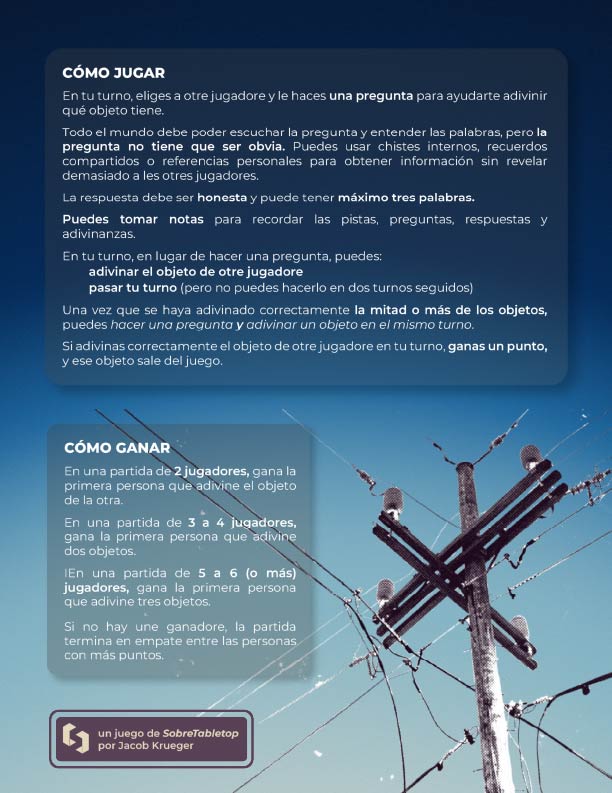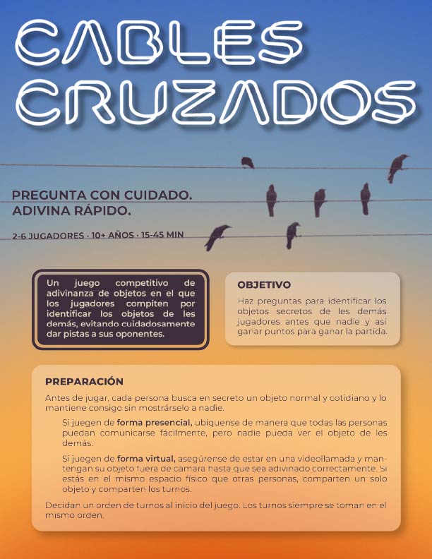 Cables cruzados es un juego competitivo de adivinanza de objetos basado en información compartida y razonamiento lógico. Les jugadores hacen preguntas por turnos para identificar qué tienen les demás, pero cada pregunta revela pistas para todes. Planea con anticipación, controla lo que revelas y adivina correctamente antes que tus oponentes.