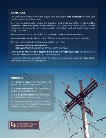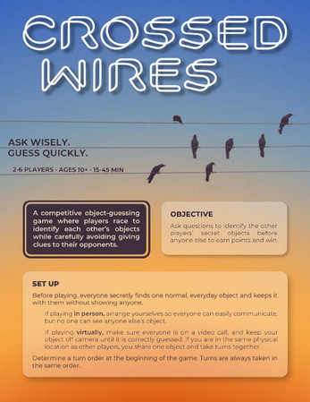 Crossed Wires is a competitive object-guessing game built around shared information and logical reasoning. Players take turns asking questions to identify what the other players are holding, but every question reveals clues to everyone. Think ahead, manage what you reveal, and guess correctly before your opponents do.