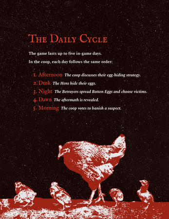 Distribuye los huevos por el gallinero, vigila los huevos podridos y descubre a les Traidores antes de que el Devoracría reclame demasiados nidos.